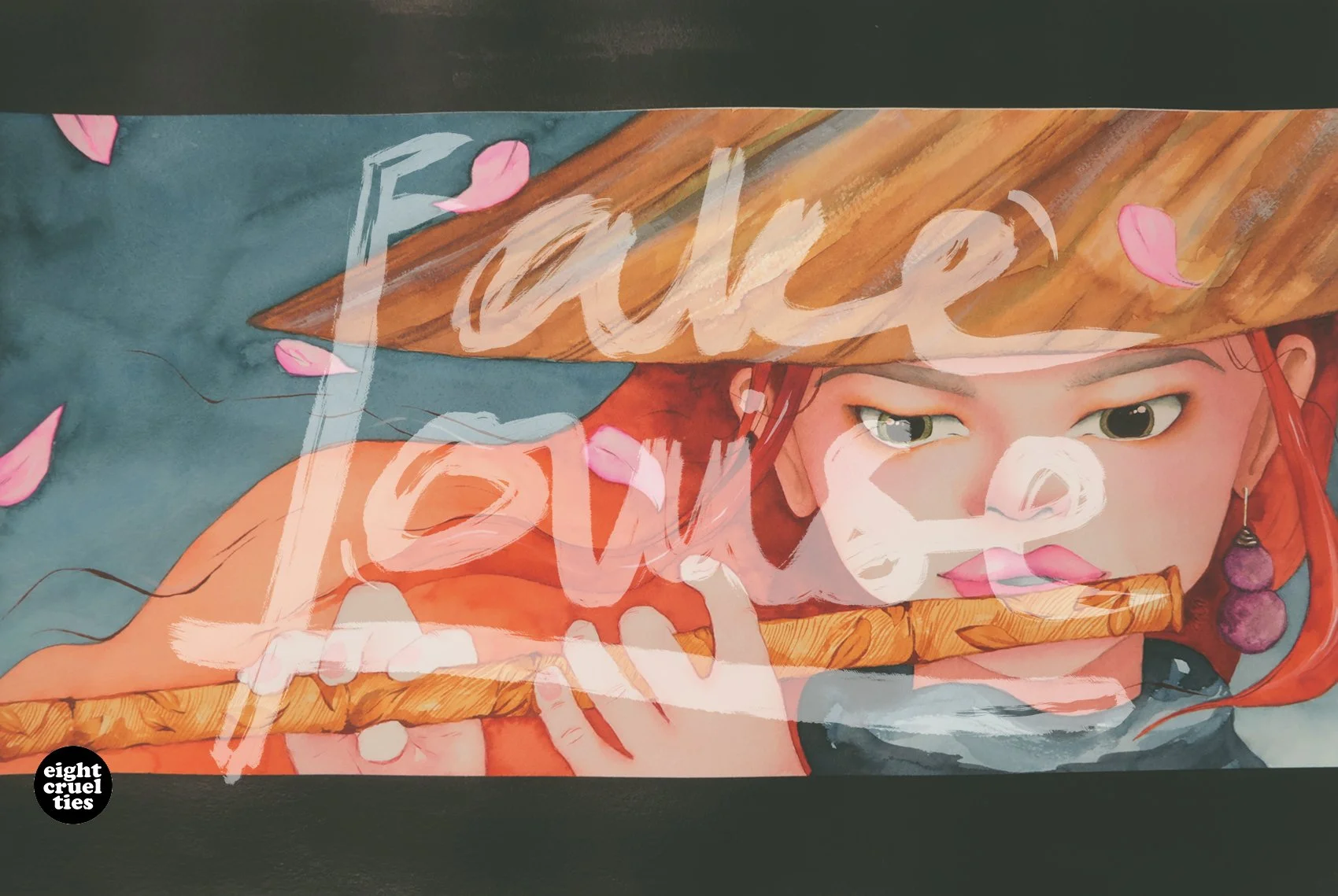 Then the flute, the flute was also one of the main characters along with the hair. It takes me a while to decide which color and what pattern to use. The golden brown was supposed to be her skin color. But I was in between this color and dark brown. And decide to use a lighter color which is golden brown. The reason is that I don’t want to remove the focus to the lower part of the picture. As people’s eyes are drawn to bold colors first then the lighter ones. The pattern was lines and leaves, to match with the falling petals.